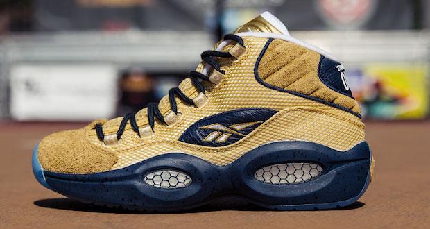 Avec du daim et du tissu de jersey comme matériaux utilisés, on continue donc dans l’original après la version en kevlar déjà vue il y a quelques temps. Pour les couleurs, le doré se taille la part belle et il est complété par du bleu marine, donnant ainsi au modèle un côté chaleureux et estival. Au niveau des détails, le « Q » habituellement présent au niveau du talon est remplacé par la citation « standing room only » et on retrouve le numéro 1 de « The Answer » juste au dessus de la semelle.
