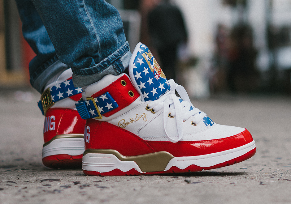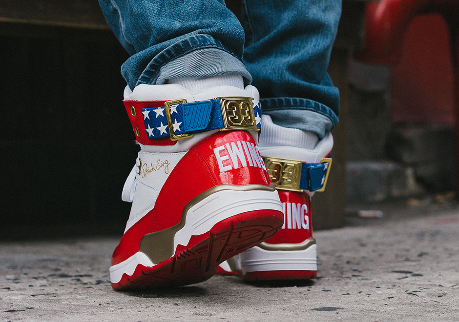 Deux pompes donc. D’un côté les Ewing 33 Hi, modèle classique de la marque, et de l’autre une collaboration avec DTLR, chaine de magasin issue du Maryland et présente sur le sol cainr-ri. Pour cette dernière – sur laquelle nous ne nous attarderons pas trop car difficilement accessible pour nous petits Frenchies – ce sont des Ewing Focus qui sont utilisées pour mettre en avant les couleurs américaines, avec la bannière étoilée sur le talon gauche et d’autres étoiles au niveau des sangles. En ce qui concerne les 33 Hi que Pat Ewing nous ressort régulièrement dans de nouveaux coloris, le thème chromatique est forcément le même. Ben oui, le drapeau américain n’est pas changé de teintes entre els deux modèles. On retrouve donc du bleu, du blanc et du rouge, le tout avec des étoiles, en particulier sur la languette. Quelques touches de dorées trouvent aussi leur place, et la discrète inscription Ewing sur les talons garde sa place comme sur les autres versions des 33 Hi.