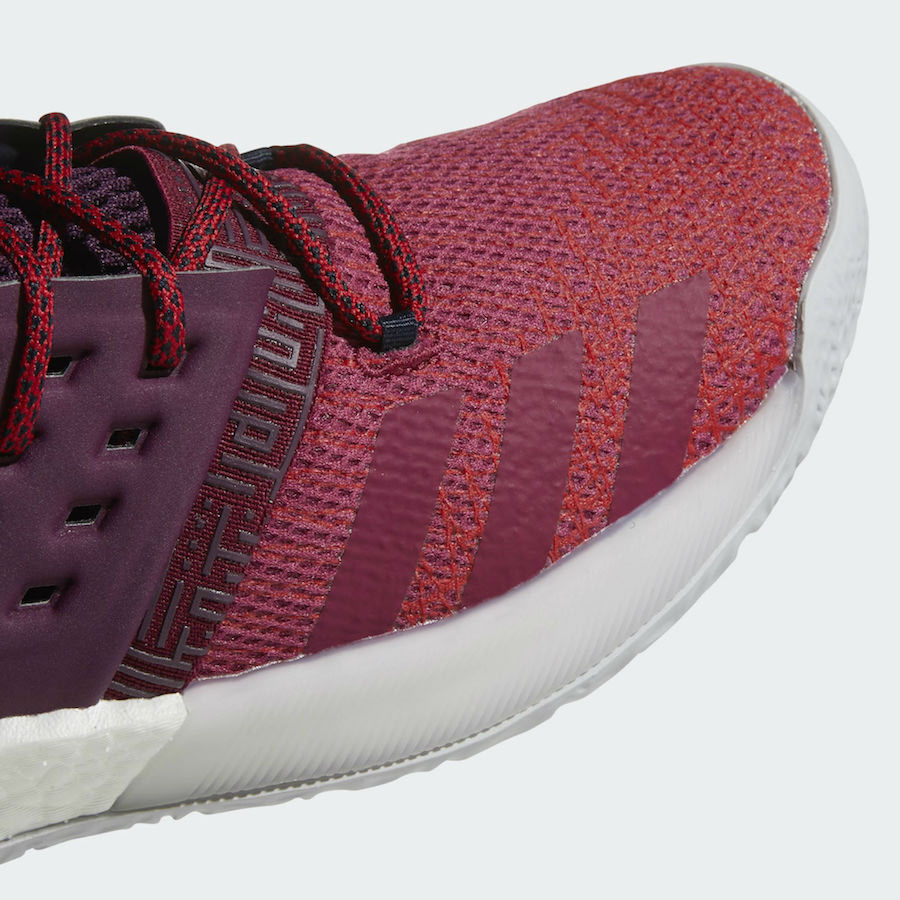 Passons à la version Adicon ou Ignite, qui s’appuie sur une teinte rouge foncée qui part ensuite sur du Bourgogne sur le coup de pied et du bleu marine autour de la cheville et sur le haut de la languette. La semelle contraste avec le reste, puisque comme nous l’avons déjà vu elle est entièrement blanche, laissant voir l’amorti Boost et remontant à l’arrière du pied.