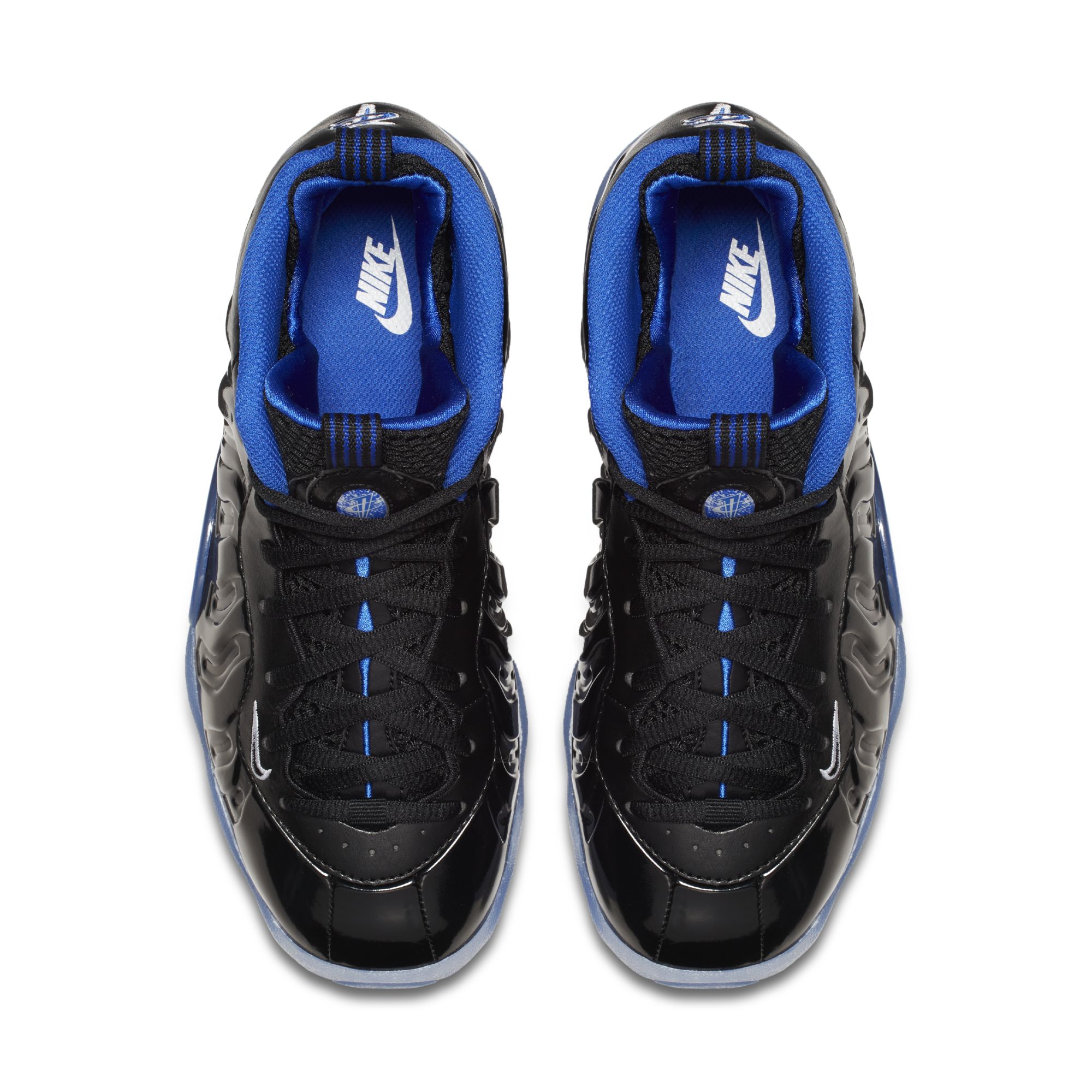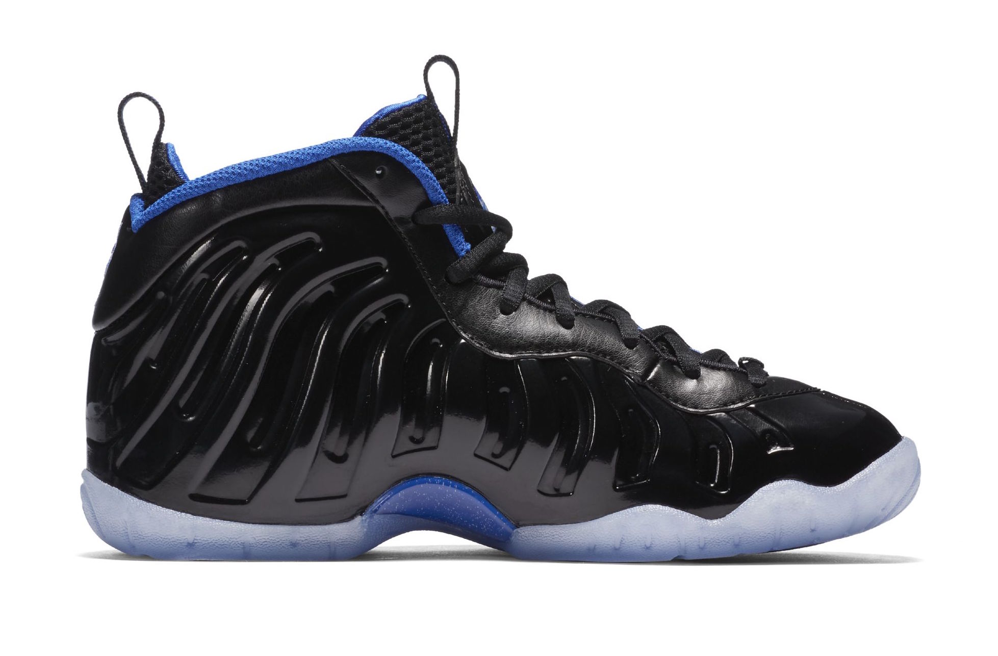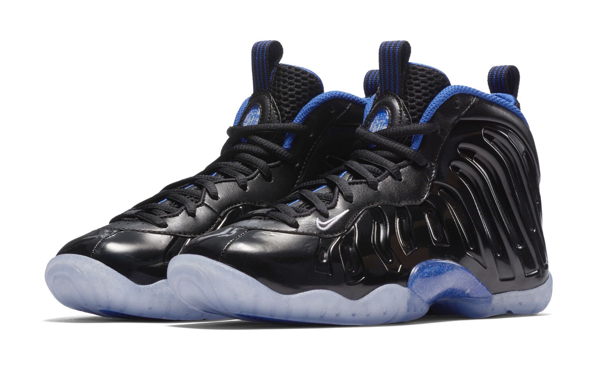 Ce sont donc les Nike Little Posite One qui reviennent rythmer l’actualité après une année 2017 vraiment chargée pour les modèles Posite, alors que le début de 2018 était plus calme sur ce sujet. On retrouve donc les chaussures pour enfants formées avec le coquillage dans un coloris lui aussi souvent en vue mais e, 2016, lorsque les 20 ans de Space Jam étaient célébrés avec de nombreuses groles suivant le thème si célèbre des Air Jordan 11 de l’époque. C’est ainsi qu’une teinte noire brillante habille la base du modèle, dont le foamposite, avec du cuir noir aussi vers le talon ou encore la languette. L’indigo se trouve lui sur le contour de la cheville, le logo 1 cent ou encore vers la semelle, aussi bien en complément de celle extérieure translucide que sur celle intermédiaire en se positionnant à mi-pied, là où la fibre de carbone se loge habituellement.