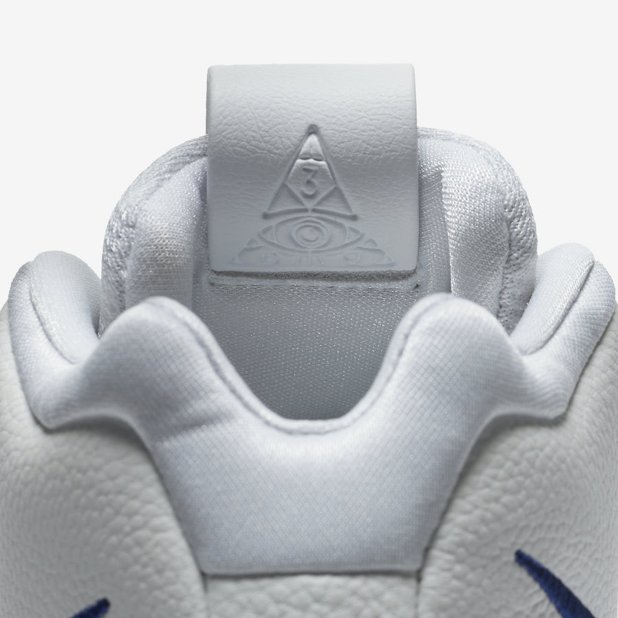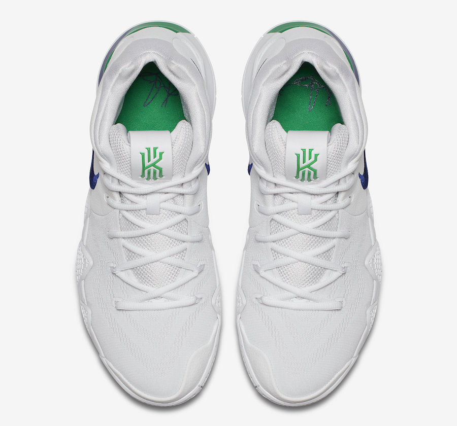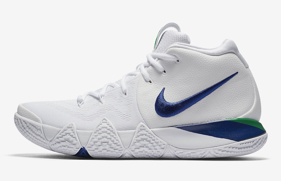 Il faut dire qu’Uncle Drew fait partie des bons investissements de Nike puisqu’il possède une image positive auprès du public en particulier des plus jeunes. Comme en plus son style de jeu ne souffre plus de l’ombre que LeBron James pouvait lui faire, c’est banco pour la firme de l’Oregon. Du moins surtout s’il joue, ce qui n’est donc plus le cas. Qu’importe, les Kyrie 4 reste un modèle apprécié à l’instar du joueur et cette version Flight Pack – aussi appelée Deep Royal – ne devrait pas manquer d’acheteurs potentiels. Avec sa partie supérieure intégralement blanche mêlant knit et cuir, elle possède un esprit très frais. Du bleu roi ainsi que quelques touches de vert complètent l’ensemble du modèle dont la semelle est également blanche. On retrouve ainsi les couleurs entre autres sur les Swoosh des panneaux latéraux, le logo KI sur la languette ou encore la ligne brisée sous le pied.