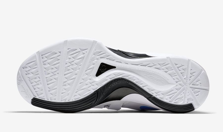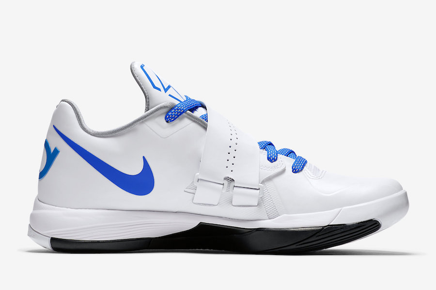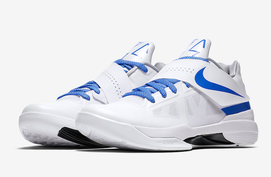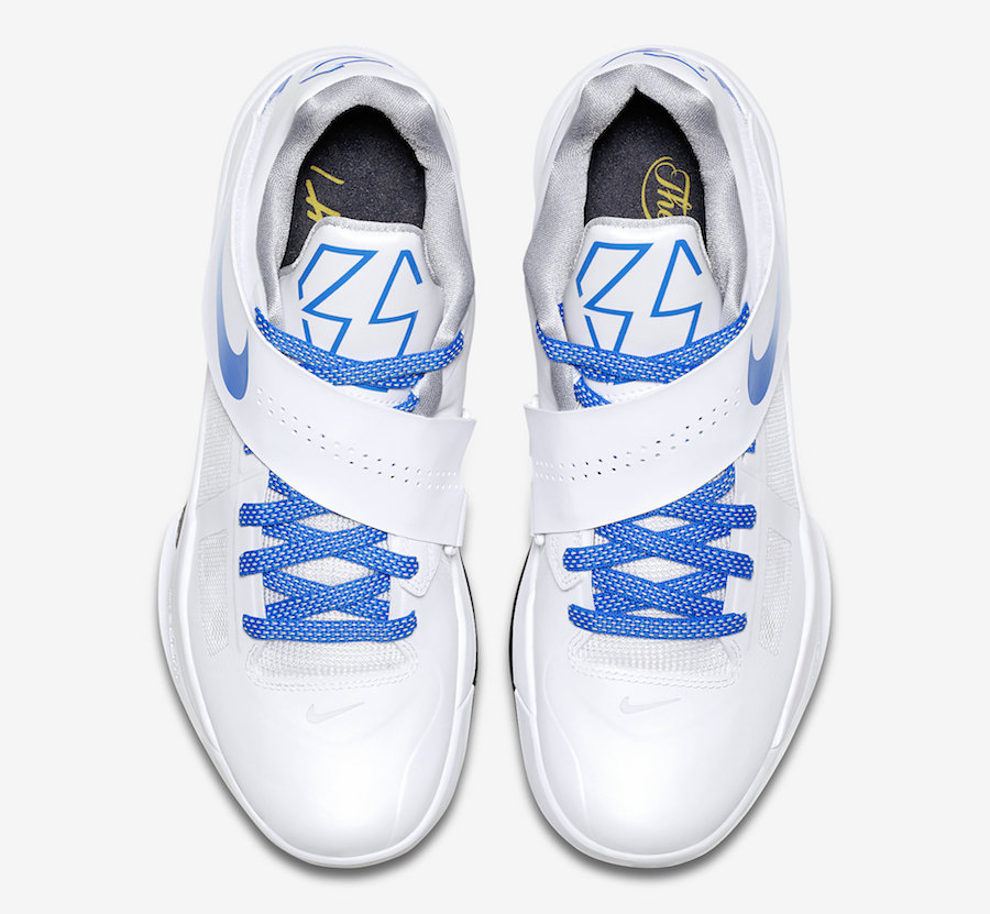 En effet, le trajet a d’ailleurs été plutôt solide puisque pour aller se frotter au Heat de LeBron James – encore lui – KD et le Thunder ont dû venir à bout de quelques équipes avec un pedigree pas dégueulasse du tout. Alors que le roster de la franchise d’OKC était certes plein de promesses mais encore d’un âge tendre, Durant, Harden, Westbrook et toute la clique ont tapé les Mavs, les Lakers puis les Spurs, soit les trois équipes qui avaient représenté l’Ouest sur la dernière marche à tour de rôle au cours des treize saisons précédentes. Excusez du peu. Dans cette épopée, Durantula a tourné à 30,6 pions par rencontre à 54,8% de réussite. Pas mal. Lors du match qui a permis au Thunder d’accéder aux Finales NBA, l’ailier a compilé 34 points et 14 rebonds pour terrasser des Spurs qui menaient pourtant de 15 unités à la mi-temps. Tout cela, c’est avec les Nike Zoom KD 4 que Kevin Durant l’a réalisé. Pour ce coloris, la base est blanche avec un peu de bleu en prime et quelques touches de gris. Des couleurs qui pourraient presque être d’actualité aux Warriors…