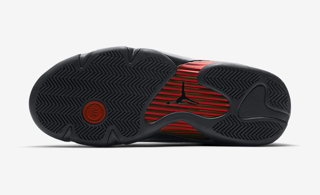 Si le nom change pour ce retour, ne nous trompons pas. Ce coloris des quatorzièmes groles de His Airness est bien le même que celui que Mike portait lors de sa destruction du Jazz il y a vingt piges. C’est ainsi que la base est recouverte de cuir premium noir, avec une dose de nubuck sur l’avant du pied, au niveau des orteils. Teinte qu’on retrouve également sur la semelle, aussi bien extérieure qu’intermédiaire. On trouve aussi quelques traces de rouge sur les Jumpman présents sur le devant des chaussures ainsi qu’à l’arrière, au-dessus du numéro 23 de la même teinte. Ce rouge se glisse enfin à quelques emplacement de la semelle tout comme sur l’inscription Jordan de la languette. On notera également un logo Jumpman dans un style Ferrari juste au-dessous de la cheville.