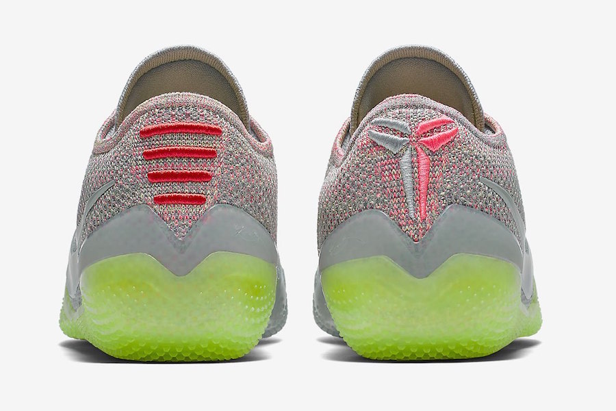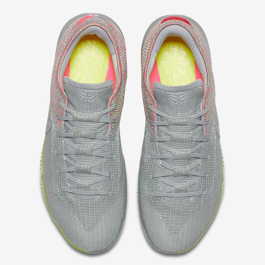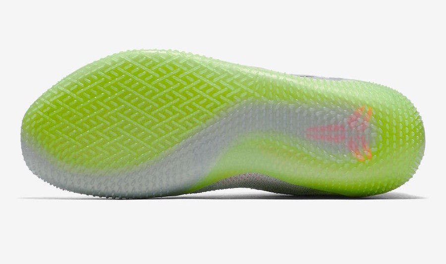 On ne reviendra pas sur le design général du modèle, les Kobe AD NXT 360 ayant déjà fait leur preuve sur ce sujet avec un look très Black Mamba avec sa tige basse. Logique me direz-vous. En ce qui concerne cette version, la partie supérieure en Flyknit est donc grise comme dit juste au-dessus. Mais ce qui caractérise ce coloris, c’est que cette base qui pourrait être terne est complétée par de nombreux détails dans des teintes plus flashy. On notera bien évidemment la semelle extérieure translucide d’un jaune-vert électrique qui saute immédiatement aux yeux. Si le Swoosh sur les panneaux latéraux reprend le gris clair tout comme le logo fourreau sur la languette, les autres éléments sont plus colorés, à l’instar des graphiques au-dessus du talon entre rouge et rose selon le pied. Un ton rosé qui apparaît également sur le Flyknit de l’arrière de la chaussure ainsi qu’à l’intérieur des pompes puisque la semelle reprend cette couleur ainsi que le vert-jaune présent sous les groles.