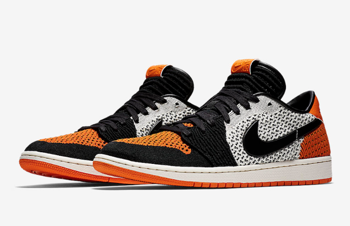 On avait vu l’an dernier débarquer du Bred ou Royal sur les Air Jordan 1 High en mode Flyknit. Il faut croire que la greffe a bien pris auprès des sneakers addicts puisque Jordan Brand poursuit sur cette lancée sur les tiges basses. C’est donc le coloris Shattered Backboard, un autre classique de la marque célébrant un match amical de JoJo à Trieste durant lequel il n’a rien trouvé de mieux que péter la planche sur un dunk, qui va bénéficier de ce traitement. L’intégralité de la partie supérieure de ce modèle est donc en Flyknit, comme son nom l’indique, avec un mélange d’orange, noir et blanc en ce qui concerne les teintes utilisées. On trouve tout de même un peu de cuir vers le talon pour poser le logo Wings.