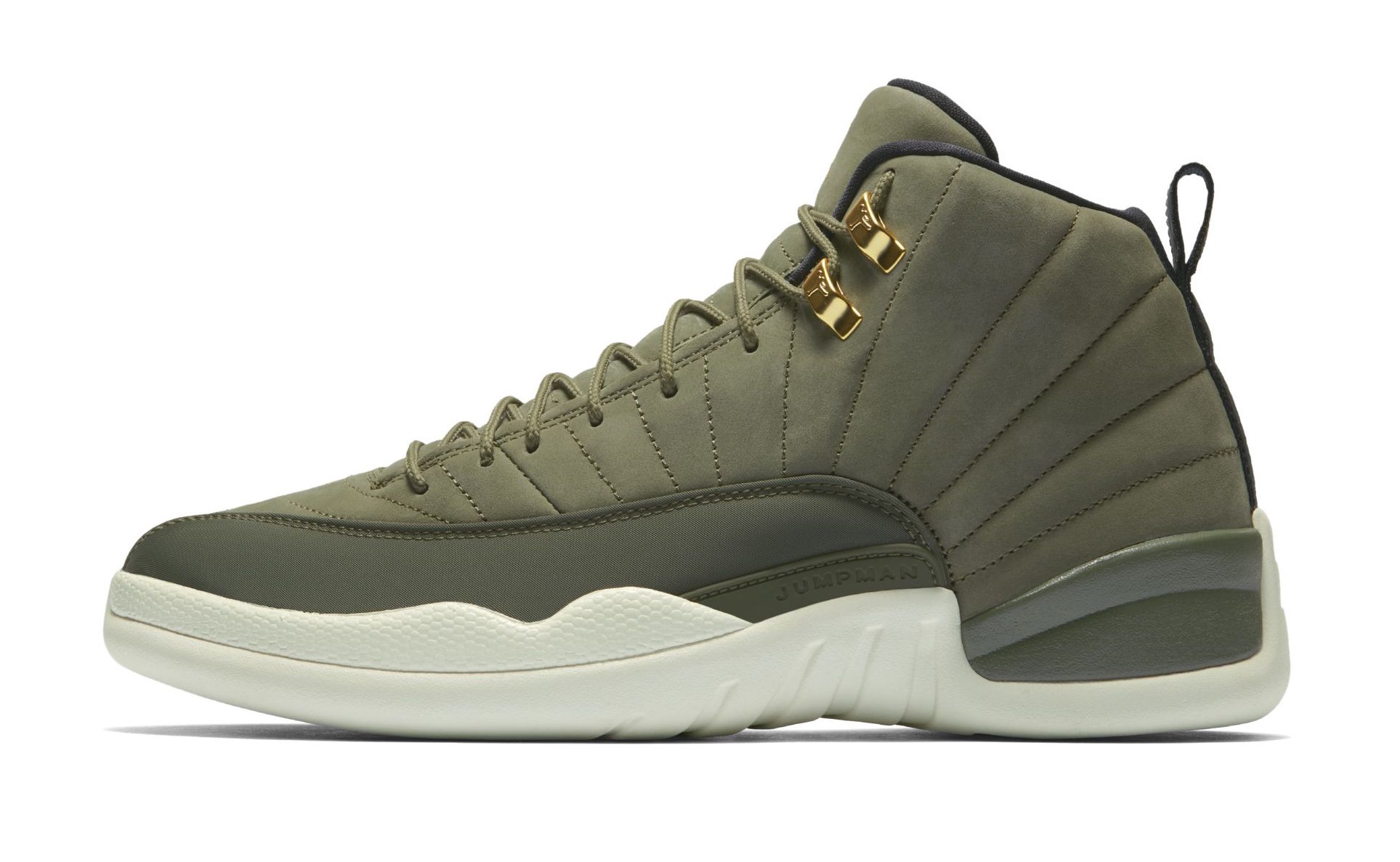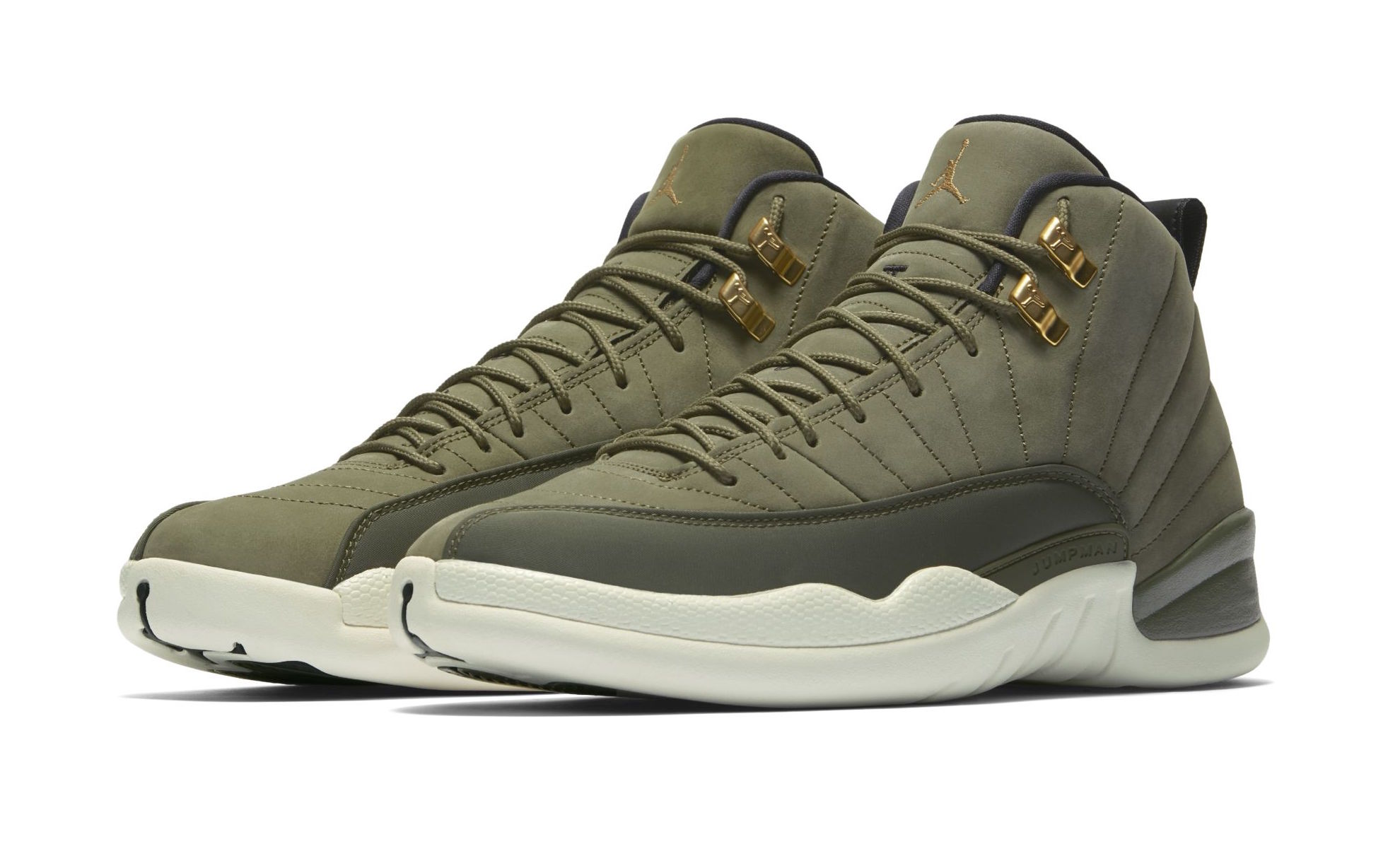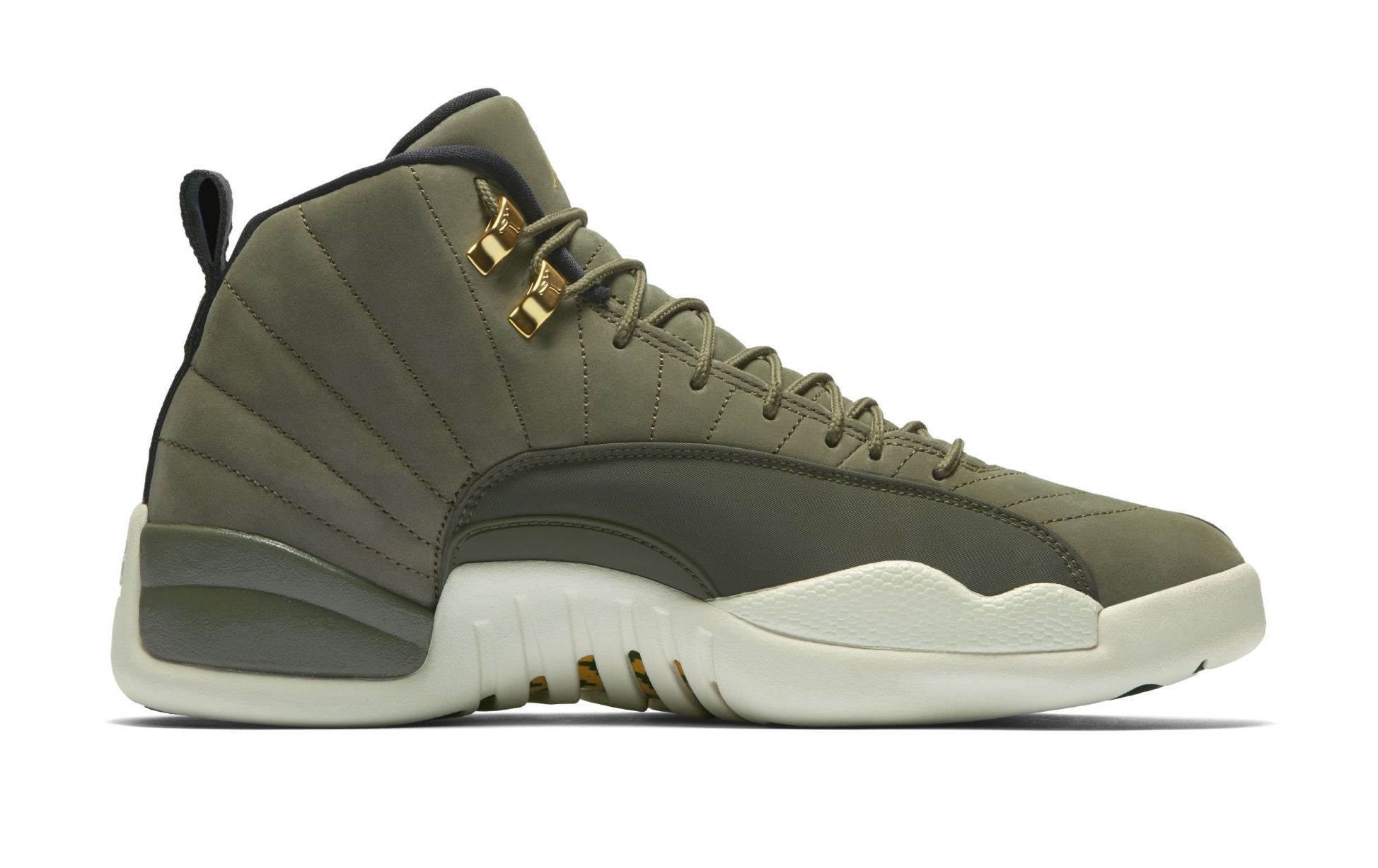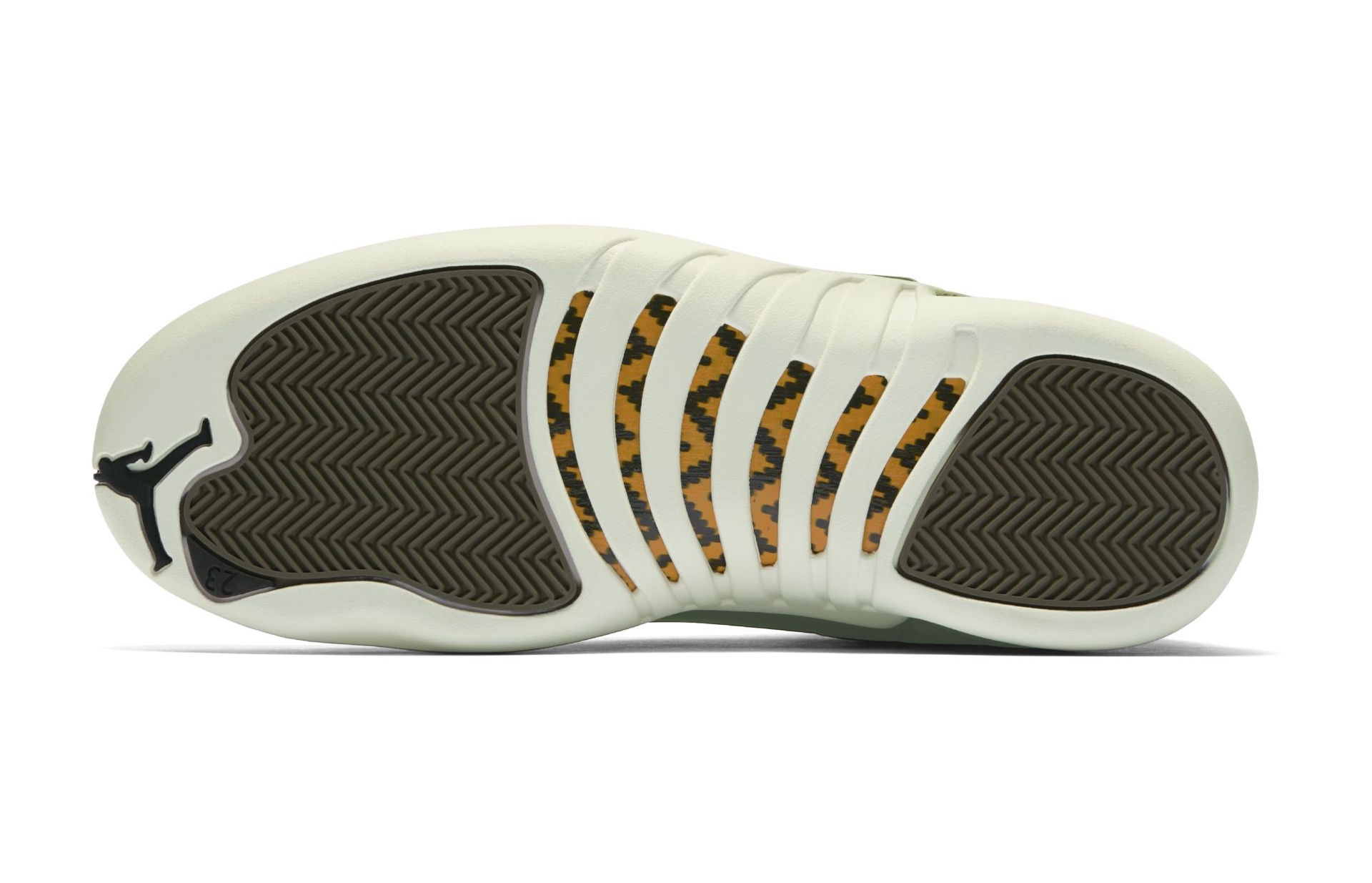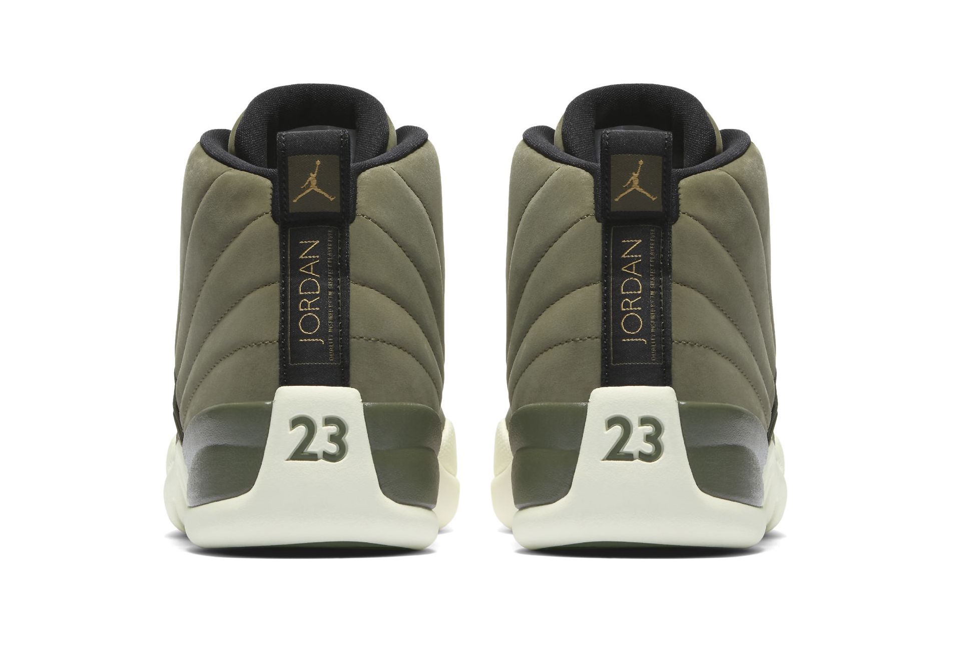 Ainsi, après le meneur du Thunder et les Air Jordan 10 Class of 2006, c’est au tour de celui des Rockets de récupérer un modèle avec son lycée comme thème. Direction West Forsyth High School donc pour les AJ 12 qui se retrouvent ainsi habillées d’un vert olive sur leur partie supérieure en daim et nylon. Cette base est complétée par des touches noires et dorées en particulier au niveau de la tirette d’enfilage, du Jumpman sur la languette ou encore sur l’intérieur du modèle – avec entre autres le logo CP3 et l’inscription Class of 2003 sous le pied – ou les œillets. La semelle intermédiaire et celle extérieure sont d’un blanc cassé, et du vert se retrouve également sur cette dernière.
