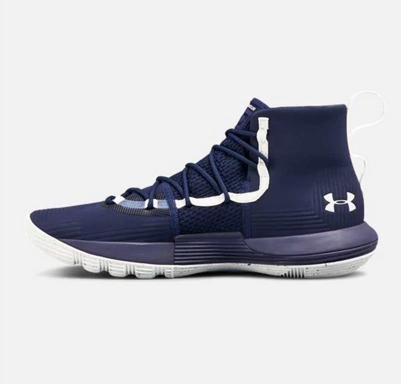 Discount, cela peut paraître exagéré pour certains puisqu’il faudra tout de même débourser une centaine d’euros pour vous offrir la paire. Mais quand on voit le tarif habituel des signature shoes ou même des modèles non taggés avec le nom d’un joueur, on descend rarement aussi bas chez les grandes marques. Il semblerait que la donne change pour toucher un plus grand marché, et Under Armour s’engouffre dans cette brèche. Niveau technique Under Armour ne néglige pas pour autant votre pied puisque qu’on peut citer pèle-mêle : une tige Maxprene, un amorti comprenant EVA, mousse Micro G et mousse Charged. Pour le design, l’aspect est assez imposant avec une semelle qui remonte plutôt haut sur les côtés afin d’assurer un maximum d’adhérence. Contrairement aux Curry 5, la tige est haute.