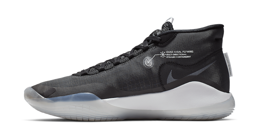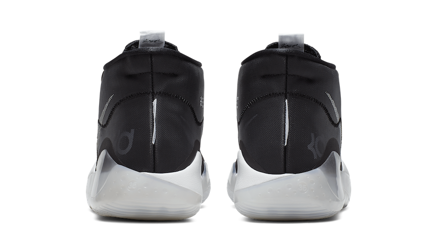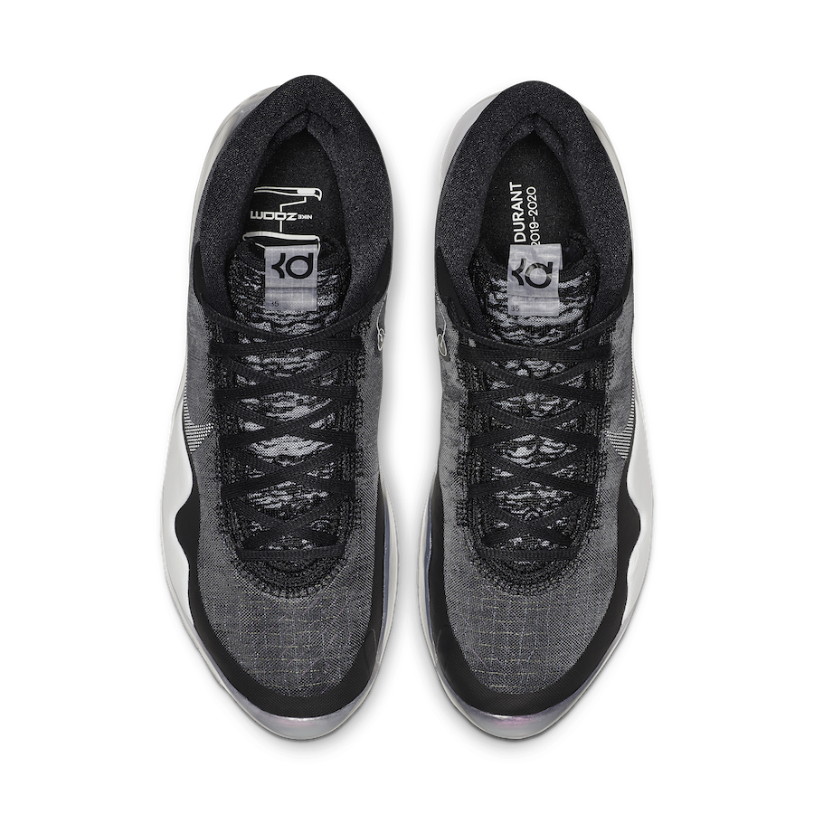 On ne va pas refaire le tour des nouveautés des KD 12 puisque vous pouvez les retrouver sur le site, mais juste se concentrer sur les couleurs appliquées pour ce thème. On ne va pas se mentir, on ne part pas sur une originalité folle, mais du coup cela correspond plutôt bien à la simplicité du modèle. De façon basique, l’empeigne en tissu étirable équipée du système Quad Axial Flywire s’affiche en noir alors que des touches de Pure Platinum se glissent sur le Swoosh du panneau latéral et le logo de la languette. la semelle intermédiaire est blanche et recouverte d’une sur-couche translucide qui débute au niveau de la semelle extérieure. Faut-il voir dans les couleurs utilisées une indication sur le premier jour de Kevin Durant après son mode gratteur de bagues aux Warriors ? Dans ce cas on se frotte peut-être déjà les mains du côté de Brooklyn.