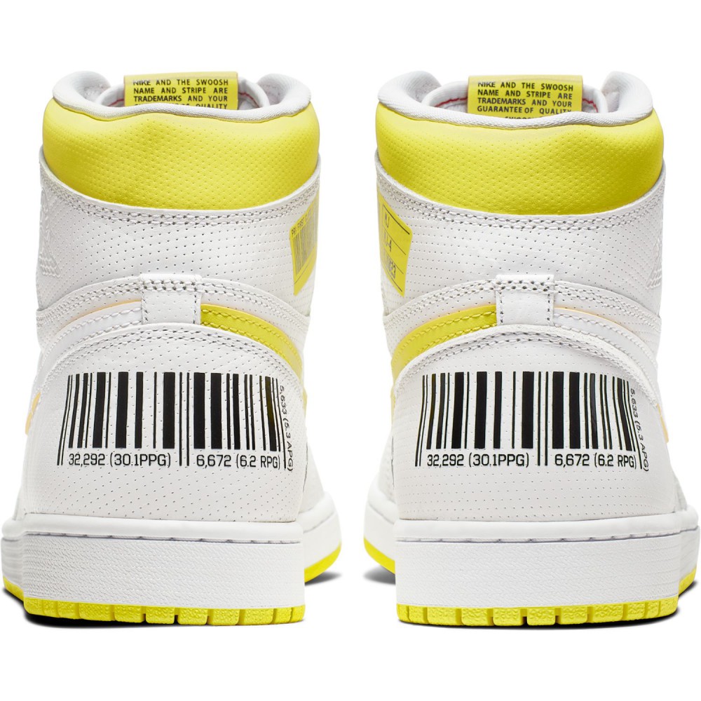 Les plus grands fans des Air Jordan 1 risquent de devoir à nouveau sortir leur porte-monnaie. Cette fois, la paire revient avec un coloris et un concept bien original. Ainsi, on retrouve une paire en cuir blanc, sublimé par quelques éléments marqués d’un jaune vif comme la semelle, le Swoosh ou la languette. Le tout est accompagné par de subtiles touches de noir pour illustrer ce qui rajoute à l’originalité de la paire : son concept. Car pour illustrer la détente de Michael Jordan, les designers ont pensé à l’image d’un… vol d’avion, rien que ça. Du coup, on retrouve sur la paire plusieurs code barres, dont un gros sur le talon, en référence à des billets d’avions, dont les chiffres font référence à des moments de la carrière de Sa Majesté. On note aussi la présence d’un symbole de recyclage au niveau du talon, au sein duquel est inscrit le numéro de MJ, le fameux « 23 ». Michael nous fait en plus l’honneur de sa signature sur la base de la cheville. En clair, une paire originale et bourrée de références à Michael Jordan, ça devrait plaire à pas mal de monde.