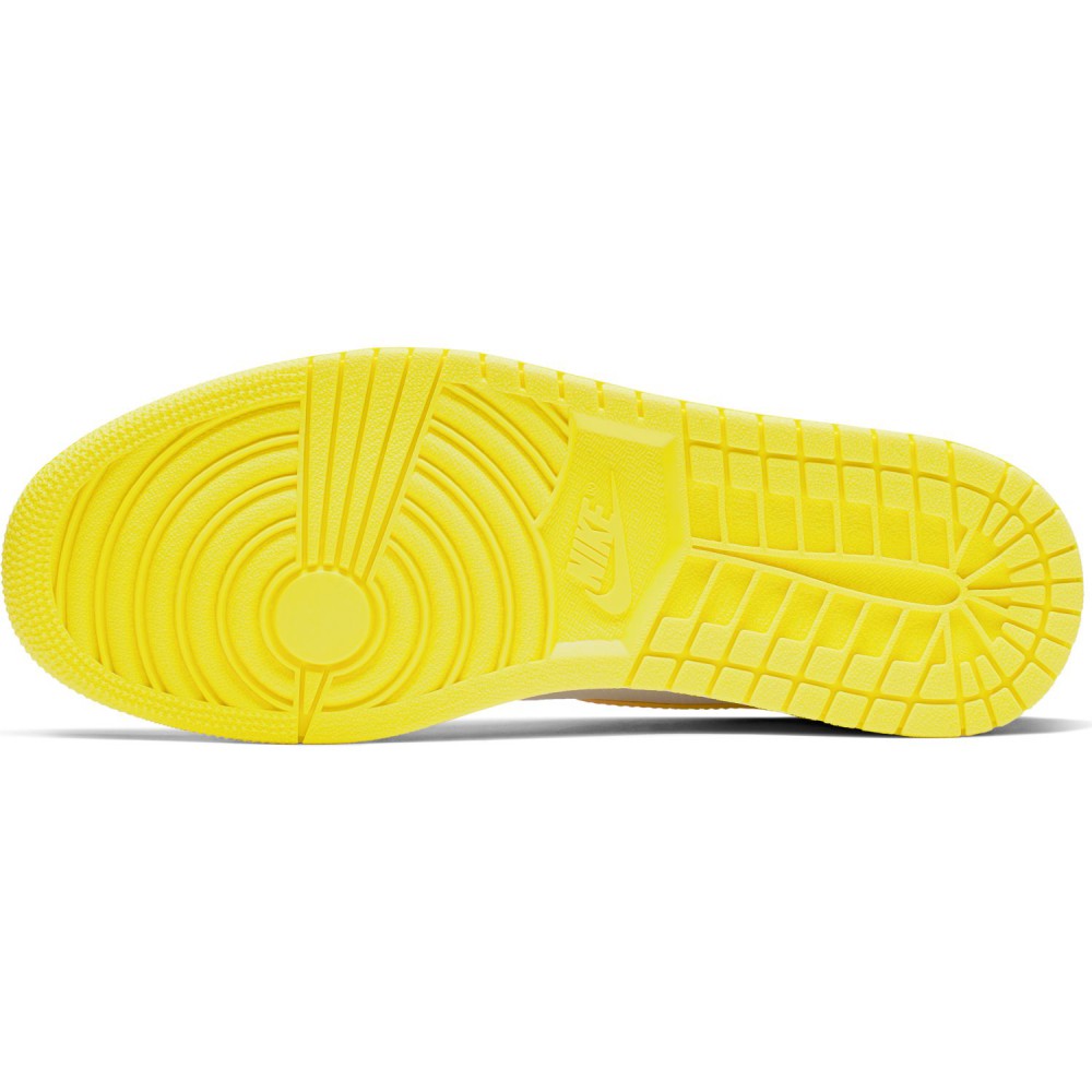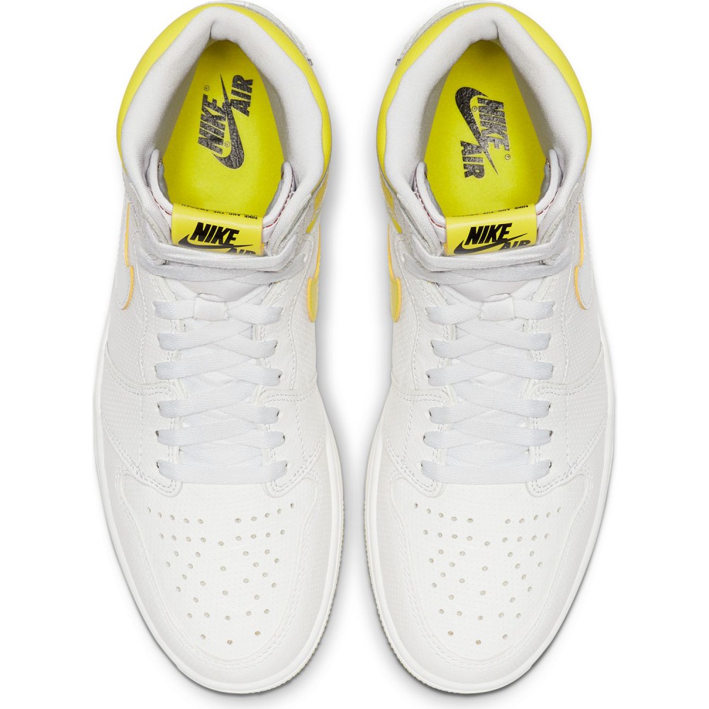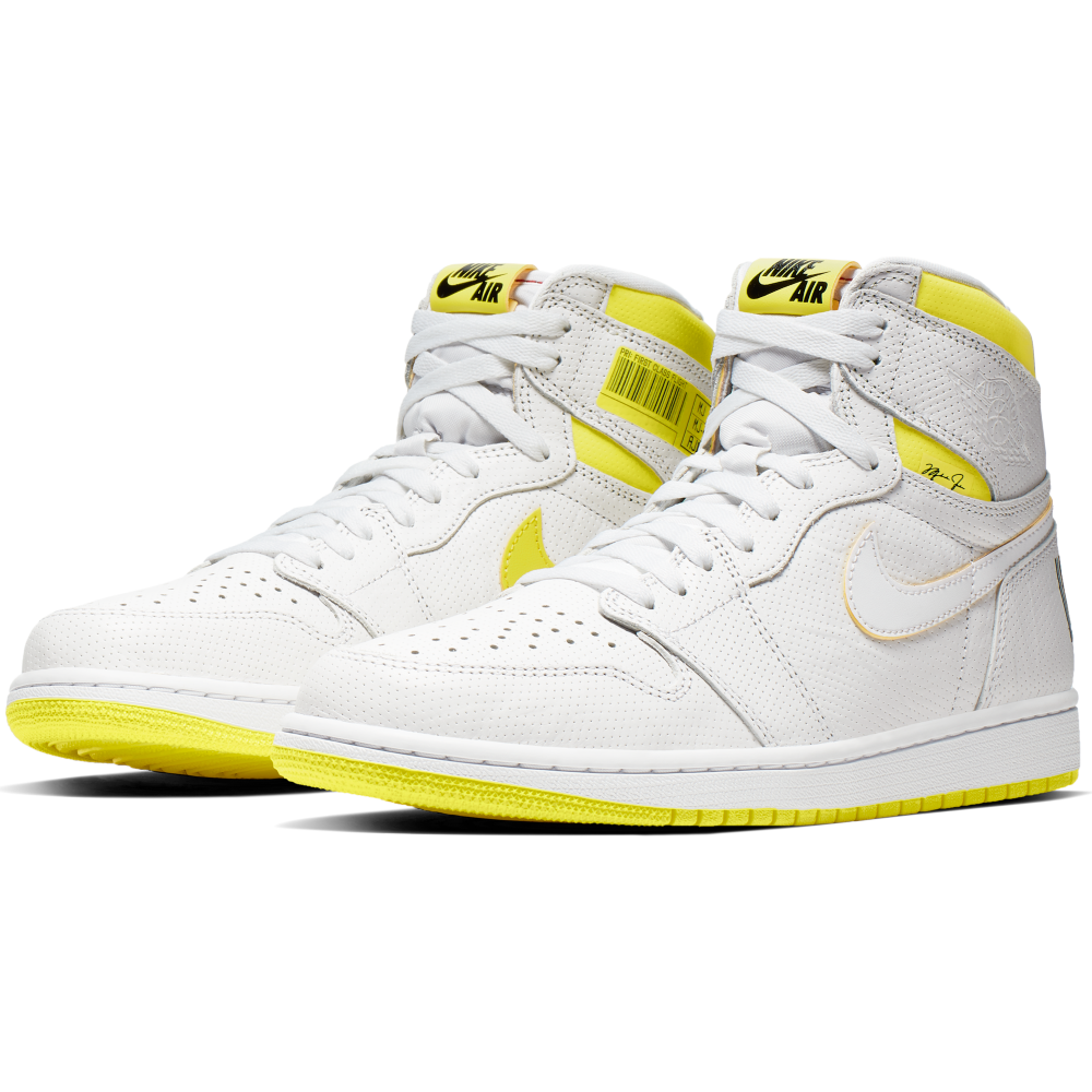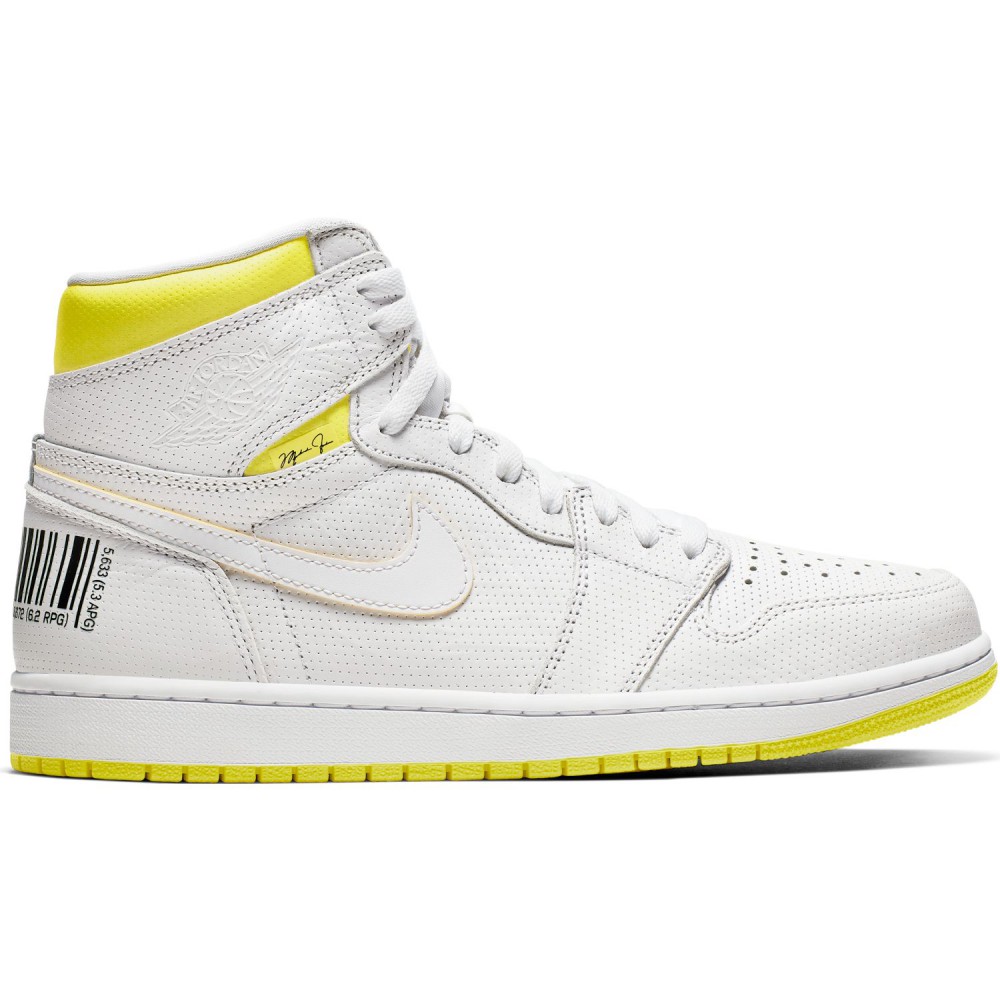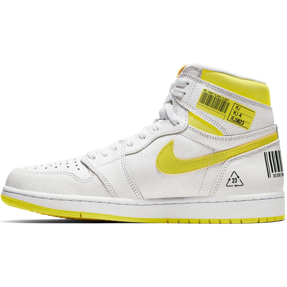 Commandez sur Basket4Ballers.com la Air Jordan I « First Class »qui présente une empeigne premium perforée en cuir blanc avec des détails jaunes pour un contraste saisissant dans une silhouette emblématique.