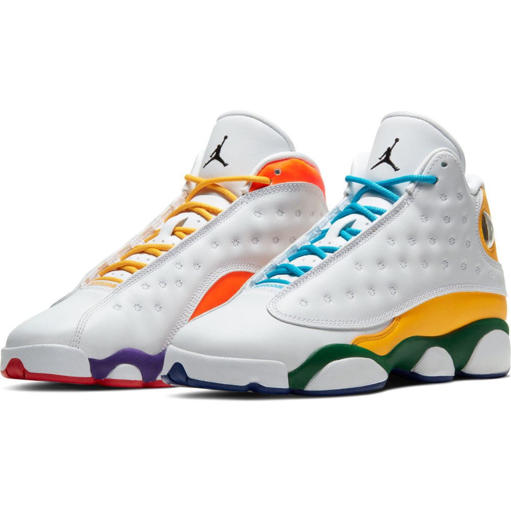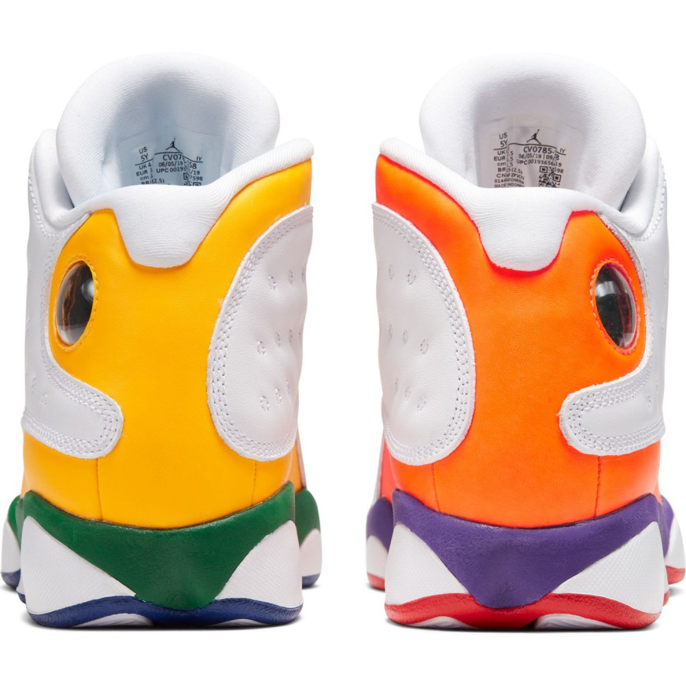 On commencera avec une petite pensée émue pour la Team Geox qui a traversé des moments difficiles à l’école. La cour de récré est une jungle où le style est évidement jugé sans pincettes par tous ses petits camarades de classe, alors il vaut mieux assumer son style pour ne pas avoir de problème. Ce sera évidemment beaucoup plus facile pour les enfants gâtés qui pourront se permettre les Air Jordan 13 Retro Playground GS exclusivement réservées aux enfants. Pas la peine d’essayer, vous n’arriverez pas à comprimer votre 48 bien généreux pour le faire rentrer dedans. Il faudra se contenter de toucher avec les yeux pour une fois. Et Jordan Brand a mis le paquet avec un coloris pétillant. En effet, l’empeigne blanche de ces AJ13 est relevée par des touches de couleurs complémentaires. Du vert, du jaune et du bleu à gauche, du orange, du violet et du rouge à droite. Un arc-en-ciel de couleurs qui donne la pêche et qui peut redonner vie à n’importe quel outfit un peu terne ou obscur.