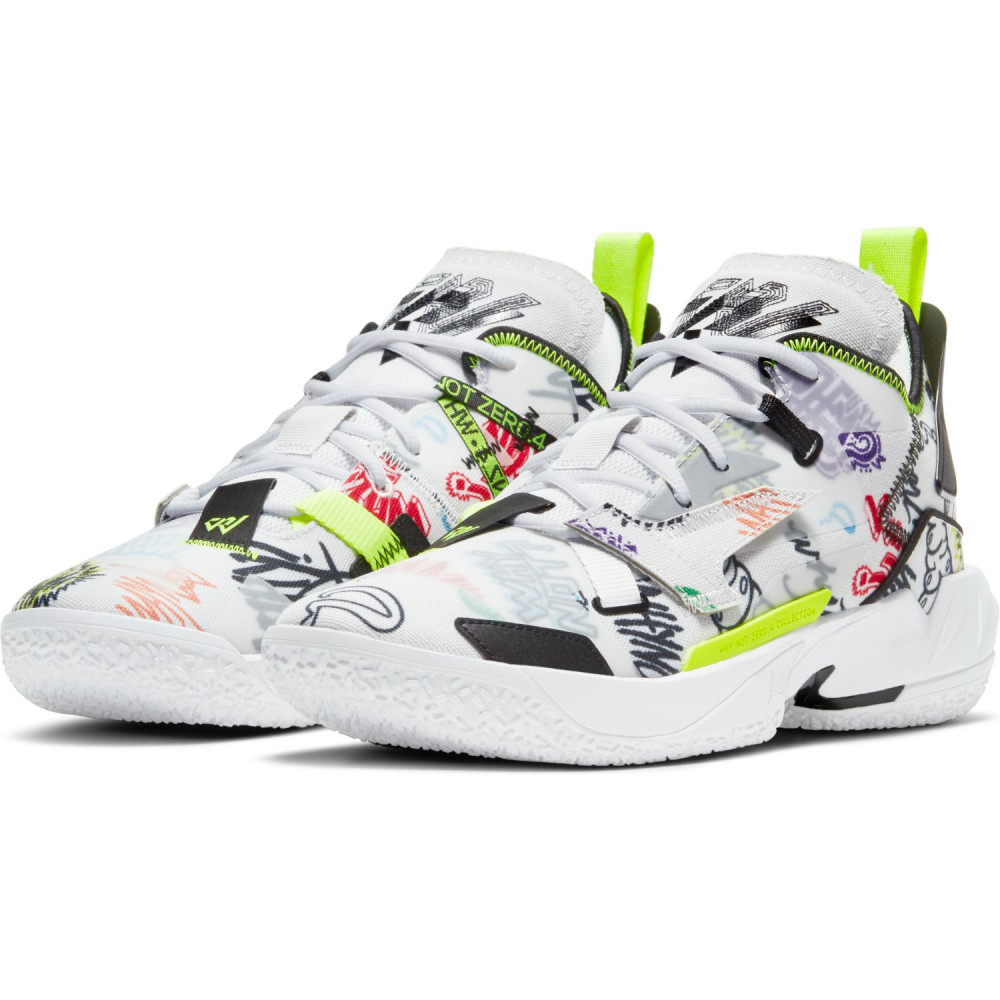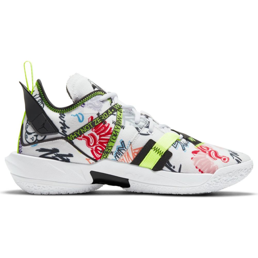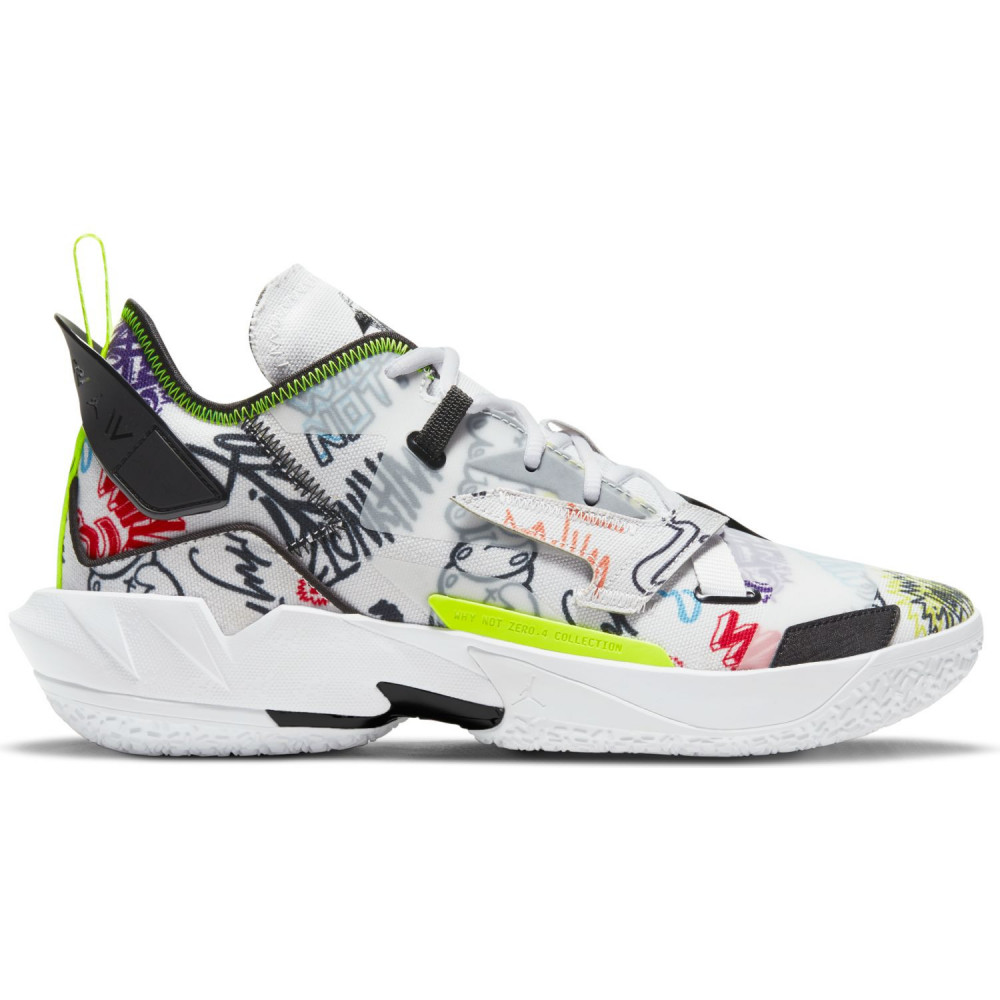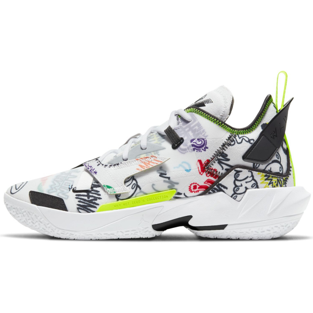 Russell Westbrook n’a vraiment pas traîné ! Moins d’un mois à peine après la révélation de la première version de sa quatrième paire signature avec Jordan Brand, le meneur des Wizards est déjà de retour avec la sortie des Jordan Why Not Zer0.4 Black Volt, second coloris bien plus tape à l’œil que son prédécesseur. À dominante de blanc, et avec de superbes touches bien senties de noir, de « volt », ce jaune fluo pétant, et de plusieurs autres couleurs (rouge, orange, violet et bleu notamment), la chaussure nous offre un visuel très réussi. À nouveau, le message « Why Not Zer0.4 » présent sur le coup du pied rajoute du cachet, tout comme les nombreuses touches de couleurs apportant un effet graffiti ou toile de peinture remplie par un artiste très inspiré. Pour finir, l’utilisation d’un système d’amorti ultra-réactif (les deux zones noires de la semelle) est bien sûr très logique lorsqu’on connaît le jeu du coco et nous fait dire que les plus explosifs d’entre vous vont kiffer. C’est un sans-faute !