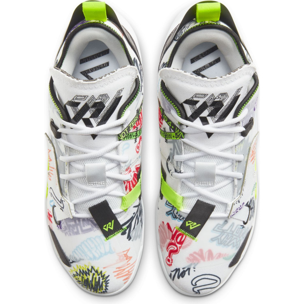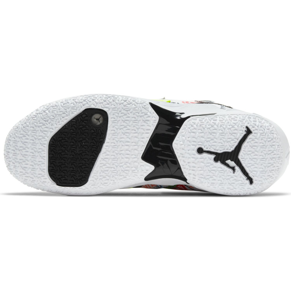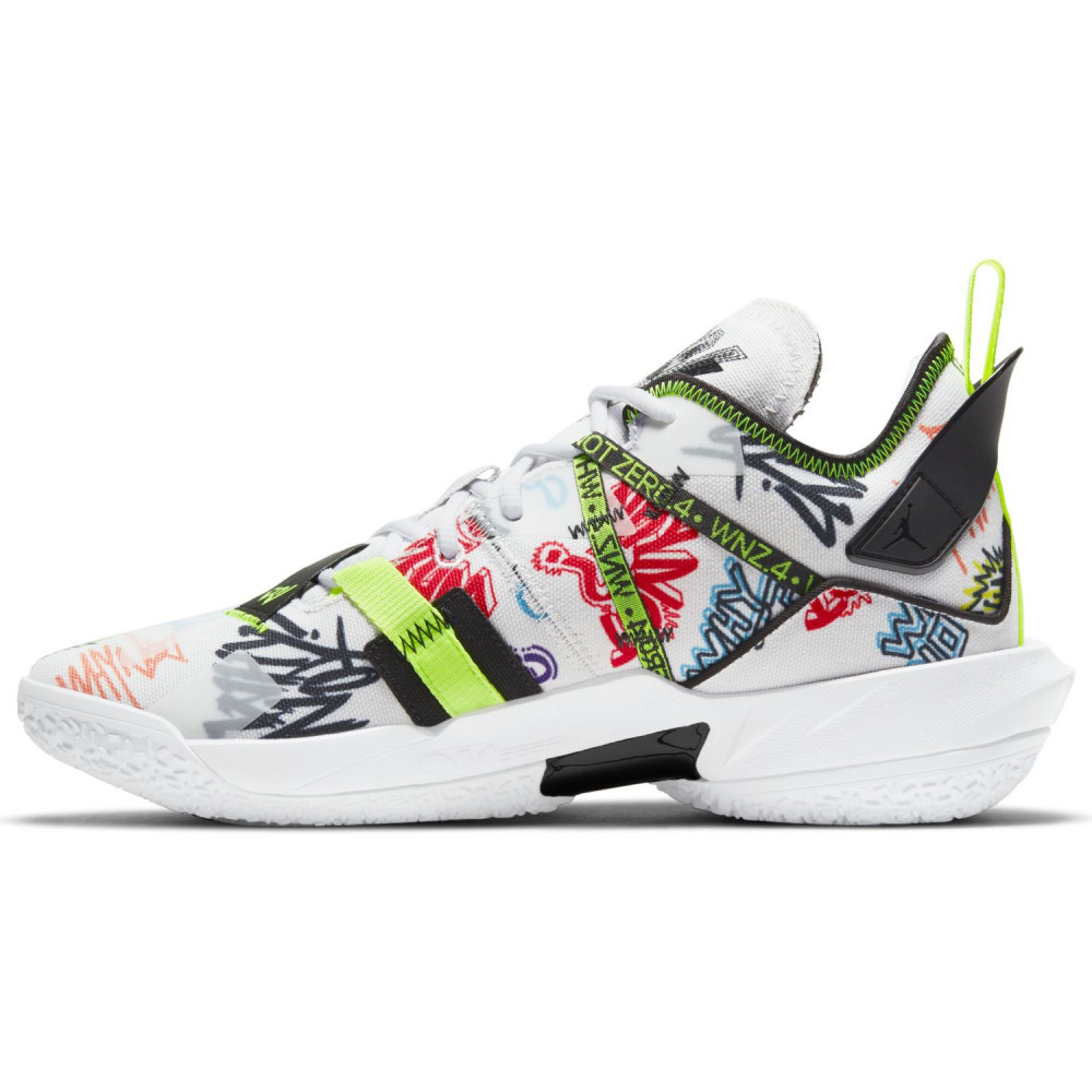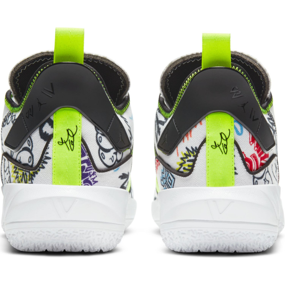 Russell Westbrook n’a vraiment pas traîné ! Moins d’un mois à peine après la révélation de la première version de sa quatrième paire signature avec Jordan Brand, le meneur des Wizards est déjà de retour avec la sortie des Jordan Why Not Zer0.4 Black Volt, second coloris bien plus tape à l’œil que son prédécesseur. À dominante de blanc, et avec de superbes touches bien senties de noir, de « volt », ce jaune fluo pétant, et de plusieurs autres couleurs (rouge, orange, violet et bleu notamment), la chaussure nous offre un visuel très réussi. À nouveau, le message « Why Not Zer0.4 » présent sur le coup du pied rajoute du cachet, tout comme les nombreuses touches de couleurs apportant un effet graffiti ou toile de peinture remplie par un artiste très inspiré. Pour finir, l’utilisation d’un système d’amorti ultra-réactif (les deux zones noires de la semelle) est bien sûr très logique lorsqu’on connaît le jeu du coco et nous fait dire que les plus explosifs d’entre vous vont kiffer. C’est un sans-faute !