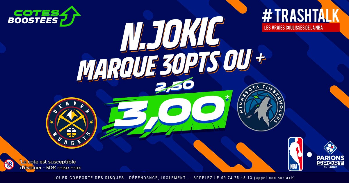 Nikola Jokic marque au moins 30 points contre les Wolves (cote de 2,50 boostée à 3,00) : Nikola Jokic évolue plus que jamais à un niveau de MVP en ce moment alors on se dit qu’il faut en profiter. Exceptionnel sur la première quinzaine de décembre, le Joker a atteint la barre des 30 points lors de trois des six derniers matchs de Denver. Et sa moyenne sur le mois de décembre est de 27,3 unités par soir, de quoi avoir confiance avant la rencontre face aux Wolves ce mercredi. Avec les nombreuses absences qui caractérisent aujourd’hui la saison de Denver, Jokic est obligé de scorer plus et on attend de lui un nouveau festival contre une équipe du Minnesota qui a encaissé en moyenne 122,8 points sur les quatre derniers matchs. Avec une cote à 3,00, c’est donc un bon coup à jouer. Dernier détail à avoir en tête, la mise maximum sur cette cote boostée est de 50 euros.