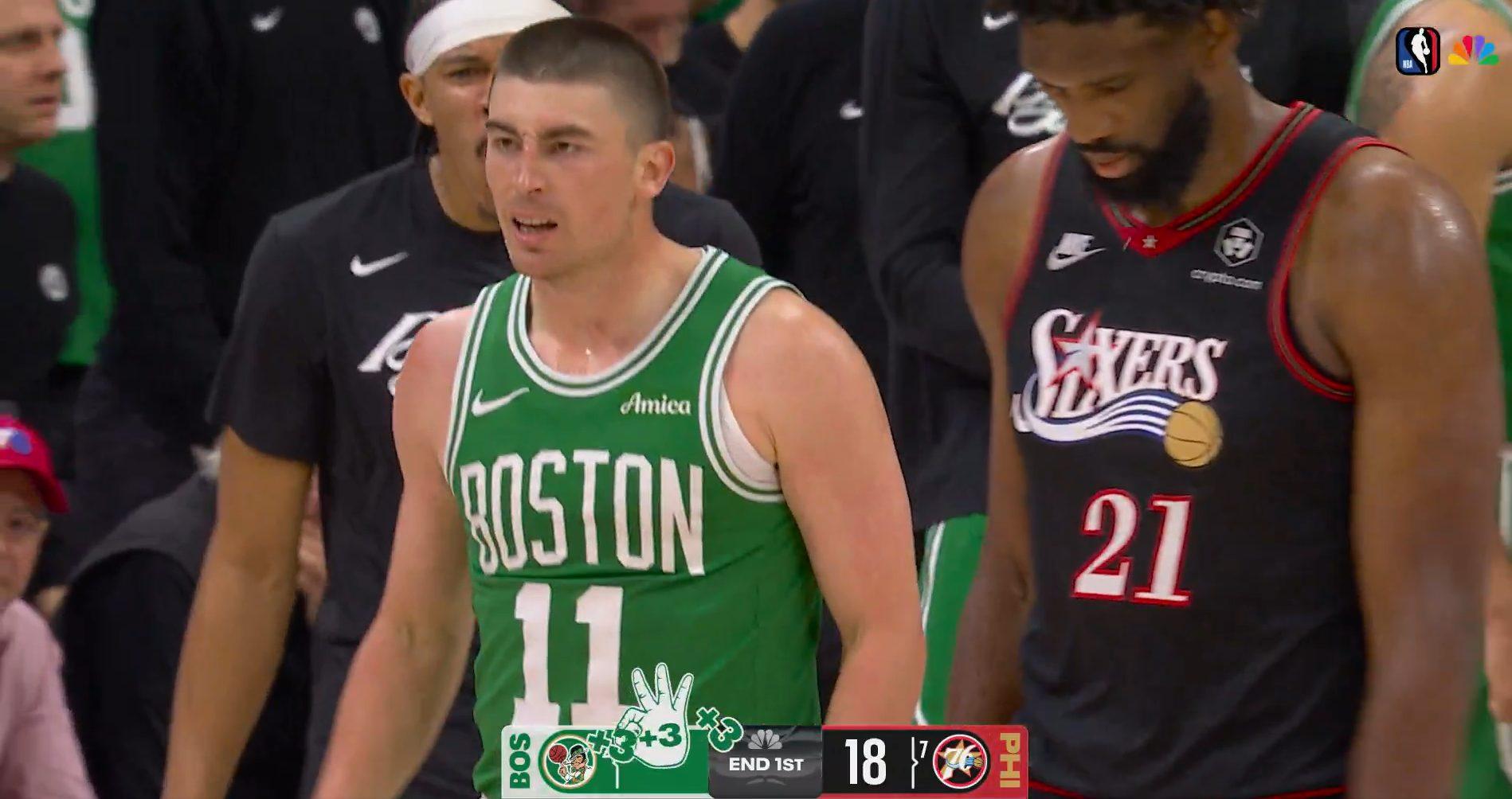 Le pivot américano-camerounais prouve que ses pépins physiques ne semblent pas le gêner outre mesure, mais il est également très seul en ce début de match. Tyrese Maxey, Paul George et surtout VJ Edgecombe sont en galère et les C’s ne se font pas prier pour sanctionner et mettre leur adversaire du soir à distance.